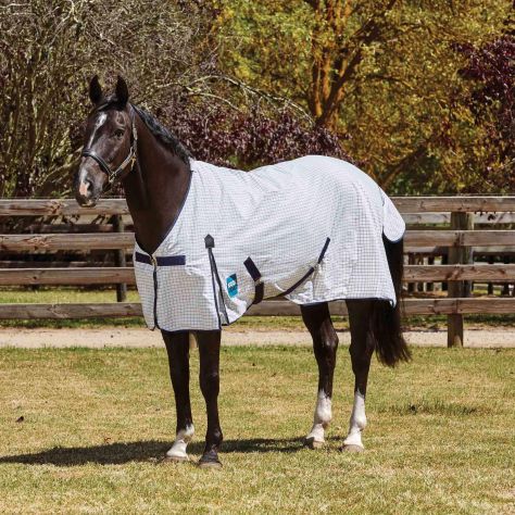 Standard neck. Lightweight polyester. UV block 95. Traditional side gussets. Single surcingle front closure. Low cross surcingles. Tail flap. Adjustable web leg straps.